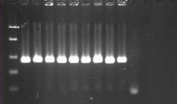 Genomic DNA from scallops was isolated by DNAreleasy Advance and a part of the supernatant was directly added to the PCR reaction. The agarose gel shows the high yield of amplified DNA fragment.