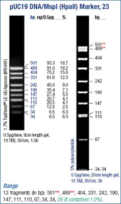 pUC19 DNA/MspI (HpaII) Marker, ready-to-use, is premixed with 6X DNA Loading Dye for direct loading onto agarose and polyacrylamide gels.