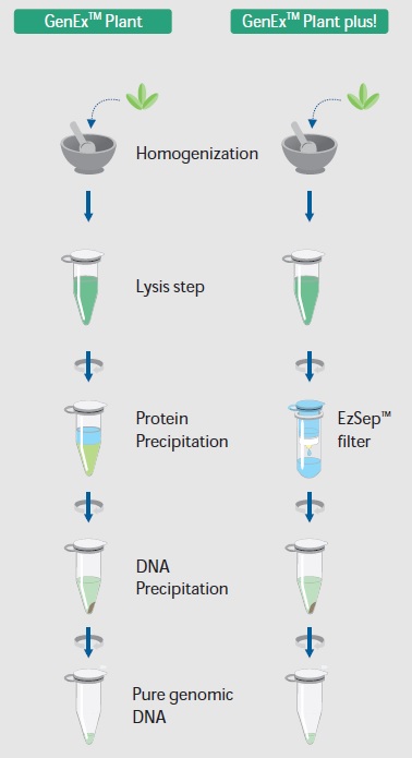 GenExTM Plant plus! kit has an additional feature, EzSepTM filter column. With certain plant samples, it is very difficult to separate cleared supernatant from pelletal debris at a protein precipitation stage. This problem also appears often when large starting sample and it may be due to low density of debris and/or low centrifugal force with conventional centrifuge. EzSepTM filter column included in the plus! kit is the device to