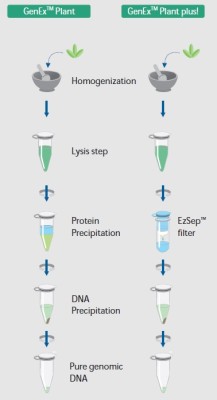 GenExTM Plant plus! kit has an additional feature, EzSepTM filter column. With certain plant samples, it is very difficult to separate cleared supernatant from pelletal debris at a protein precipitation stage. This problem also appears often when large starting sample and it may be due to low density of debris and/or low centrifugal force with conventional centrifuge. EzSepTM filter column included in the plus! kit is the device to