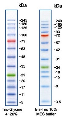Protein Marker EXtended contains 13 pre-stained proteins that resolve into sharp, tight bands in the range of 3,5-245 kDa.Protein Marker 5-245kD Extended The Protein Ladder allows to monitor molecular weight separation during electrophoresis, estimate molecular weights. The marker is ready-to-use. There is no need to boil. Easy to identify: Proteins are covalently coupled with a blue chromophore except for two reference bands; green band at 25 kDa and red band at 75 kDa.