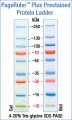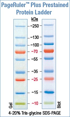 Thermo Scientific PageRuler Plus Prestained Protein Ladder is a mixture of nine (9) blue-, orange- and green-stained proteins (10 to 250kDa) for use as size standards in protein electrophoresis (SDS-PAGE) and Western blotting.