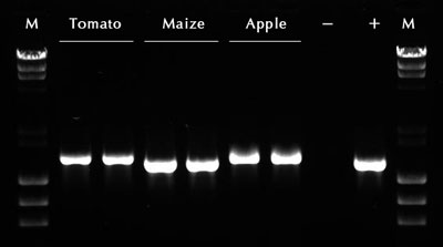 B) próbki wyłuskanych nasion pomidora, kukurydzy oraz jabłka umieszczono w 20 µl mieszaninie PCR. Do dwóch amplifikacji DNA mitochondrialnego każdej z próbek użyto Phire Plant Direct PCR Kit. Uzyskane fragmenty DNA różniły się długością w zależności od rodzaju rośliny. + oraz - oznaczają reakcje kontrolne z lub bez oczyszczonego DNA.