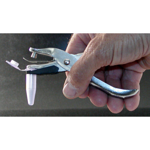 The leaf tissue punch produces a single 1/4 inch diameter disc. The punch holds a standard snap-top or screw-top microvial in position to receive the sample without further manipulation.